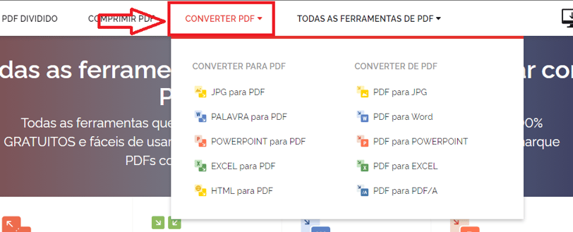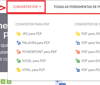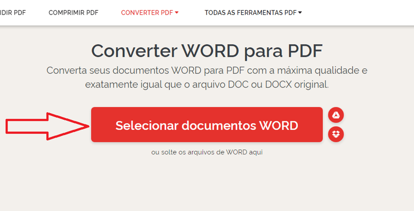 Lá se encontram os diversos formatos para qual o site converte para PDF. Escolha o formato do seu arquivo corretamente.